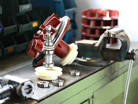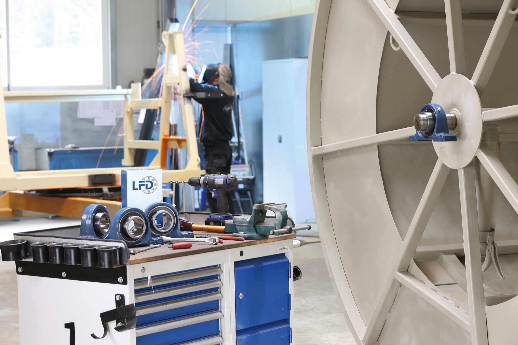 Die rotierende Stahltrommel besitzt eine Edelstahlachse, die in einem flankierend angebrachten LFD-Stehlagern endet. An dieser Stelle lagert das Gewicht der schweren Stahltrommel und genau dort werden die hohen Zugkräfte beim Einzug der am Boden reibenden Rohre aufgefangen. Auf Robustheit ausgelegt sind auch die Dreifach-Rollenführungen des Spulwagens, weil beim Aufspulen des Rohres enorme Seitenkräfte entstehen. Es muss über die gesamte Breite der Trommel exakt aufgewickelt werden, was extrem schwierig ist, wenn es seitlich in der Fahrspur abgelegt wurde. In der Buchse des Spulwagens sind Rillenkugellager von LFD verbaut. Sie unterstützen die Funktion des Führungsbolzens, der der Nut der Spindelwelle folgt.  Die Spindelwelle wiederum ist beidseitig mit funktionsgenau angepassten LFD-Flanschlagern gelagert, damit ein störungsfreier Betrieb gewährleistet ist.