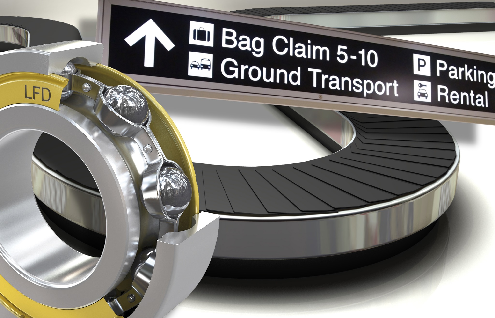Anlagen für den Fluggepäcktransport laufen rund um die Uhr ohne Unterbrechung durch und müssen möglichst wartungsfrei und zuverlässig ihren Dienst tun. Die Transportrollenbänder sind mittlerweile auf einen Gepäcktransport von bis zu 10 m/s ausgelegt. Ein störungsfreier Ablauf ist daher nur mit qualitativ hochwertigen Lagern und entsprechenden Leichtlaufeigenschaften zu gewährleisten. LFD-Lager haben bei den entsprechenden Tests alle Voraussetzungen einwandfrei bestanden und werden daher weltweit im Fluggepäcktransport eingesetzt.