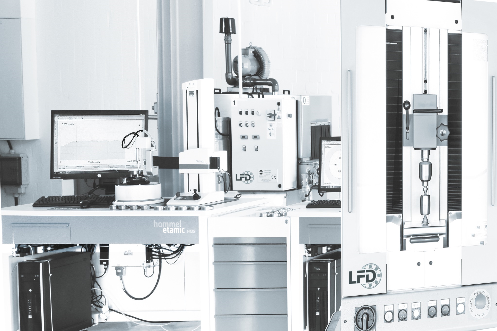 Die LFD-Gruppe besitzt eigene Prüfstände, um den hohen Qualitätsstandard der LFD-Wälzlager fortlaufend zu verifizieren und Lebensdaueranalyse im eigenen Haus durchzuführen. Auf unseren Prüfständen können die Wälzlager axial oder radial belastet werden. Eine kombinierte Belastung ist darüber hinaus auch möglich. Während des Prüfvorgangs werden die Prüfbedingungen, wie u.a. die Temperatur der Ölumlaufschmierung, die Prüfkräfte und die Motordrehzahl durchgehend überwacht. Diese Prüfbedingungen können während der Prüfung konstant gehalten bzw. nachgeregelt werden. Die Prüfung wird mit den relevanten Prüfbedingungen und Kennwerten während der gesamten Prüfphase durchgehend dokumentiert.